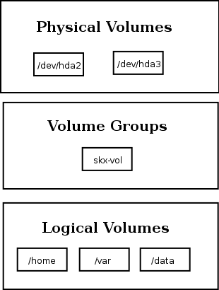 - These are your physical disks, or disk partitions, such as /dev/hda or /dev/hdb1. These are what you’d be used to using when mounting/unmounting things. Using LVM we can combine multiple physical volumes into volume groups.